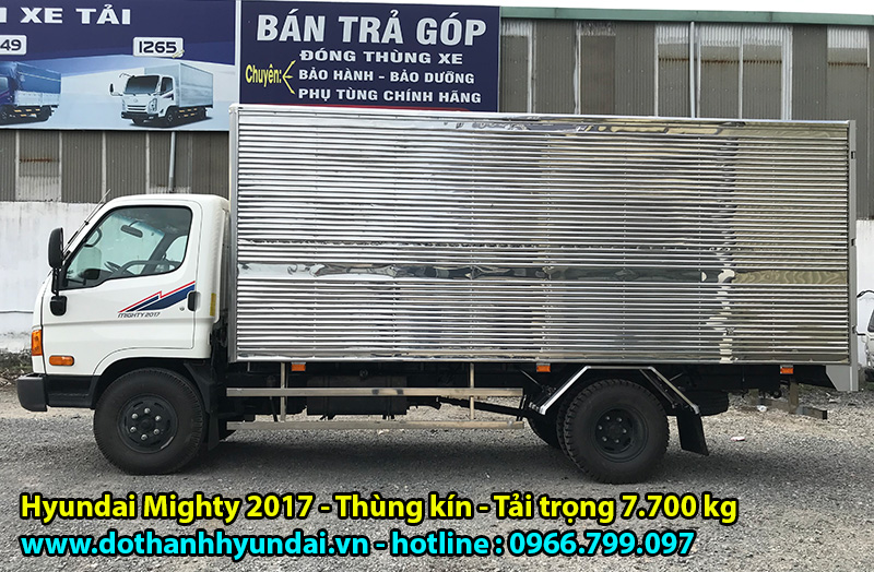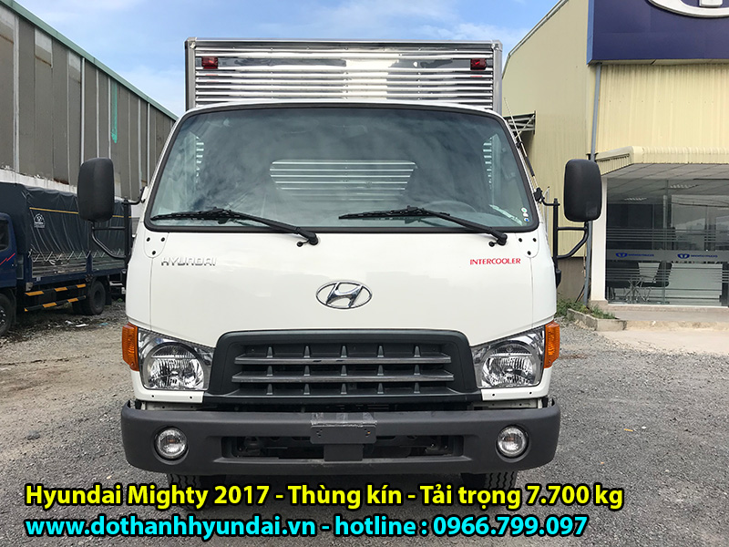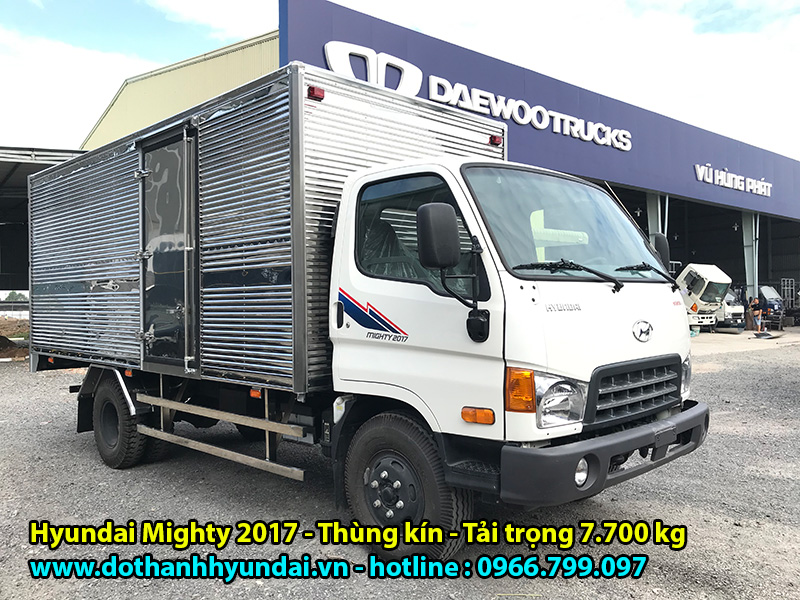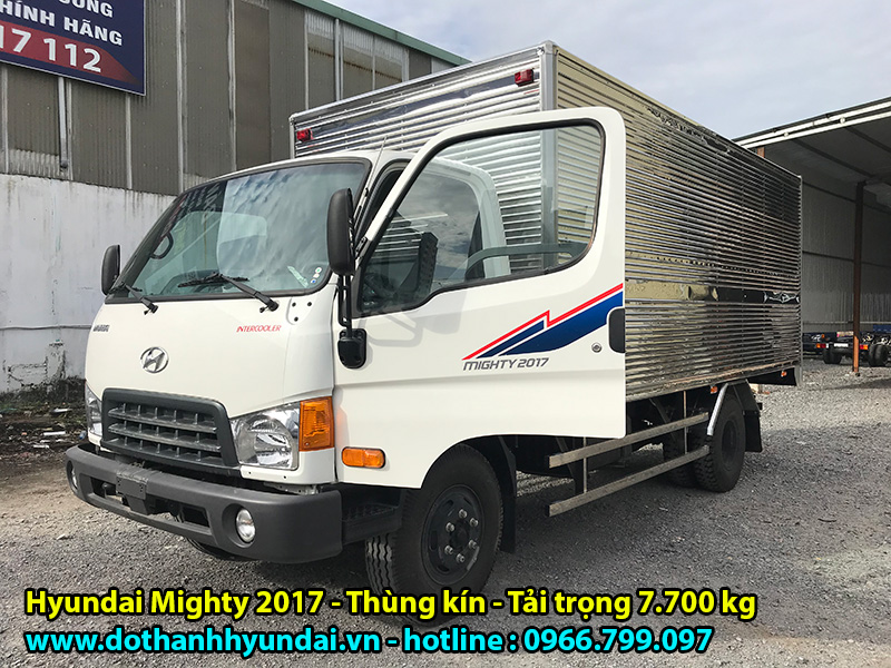 Xe tải Hyundai Mighty 2017 thùng kín là dòng xe lắp ráp nâng tải ra CÀ VẸT HYUNDAI đầu tiên trên thị trường hiện nay, với tải trọng cao lên đến 7.700 Kg đối với thùng kín và 7.900 Kg đối với thùng mui bạt. Hyundai Mighty 2017 được phân phối bởi nhà máy ô tô Đô Thành (còn gọi là Hyundai Đô Thành) – một thương hiệu nằm trong TOP những nhà máy lắp ráp và phân phối xe ô tô tải lớn nhất tại thị trường Việt Nam.