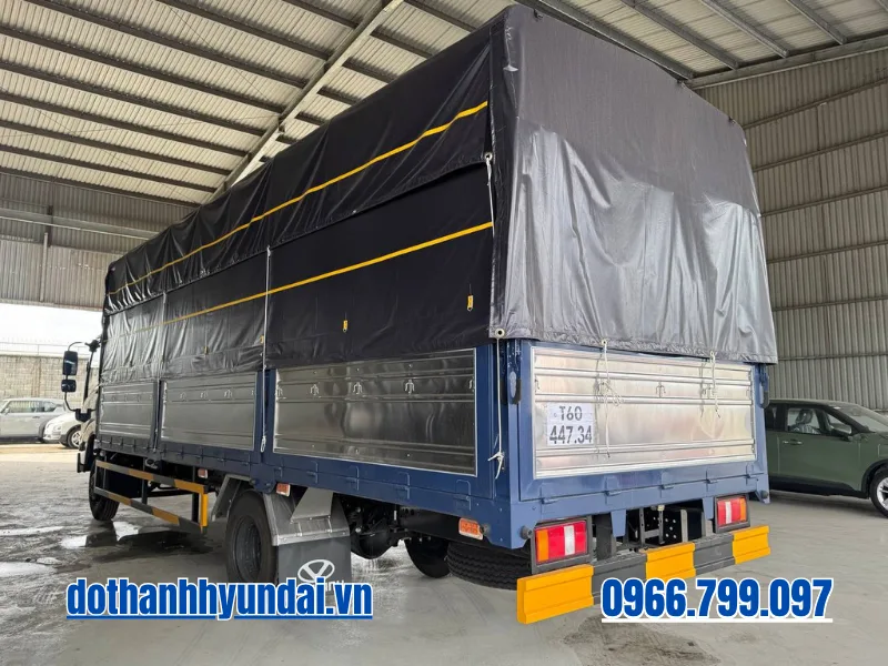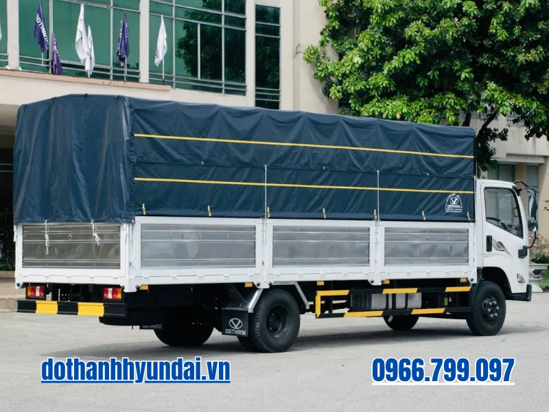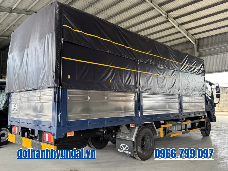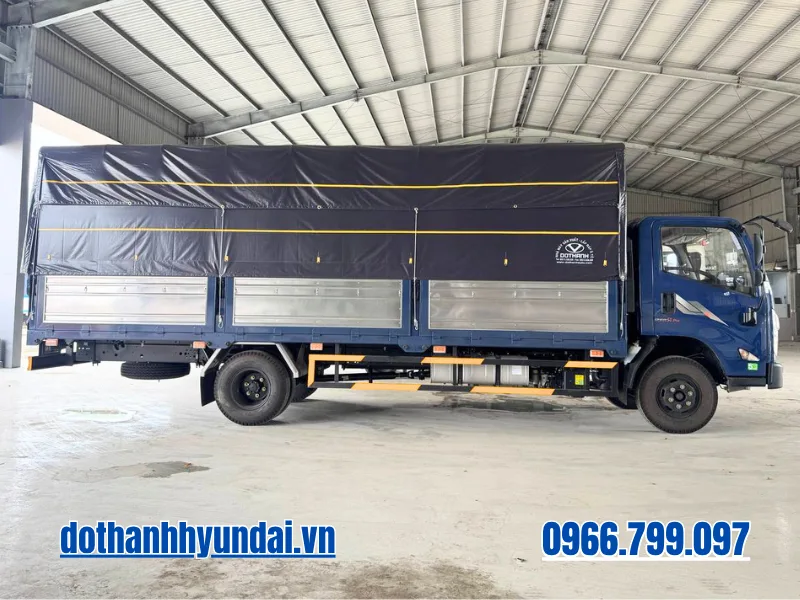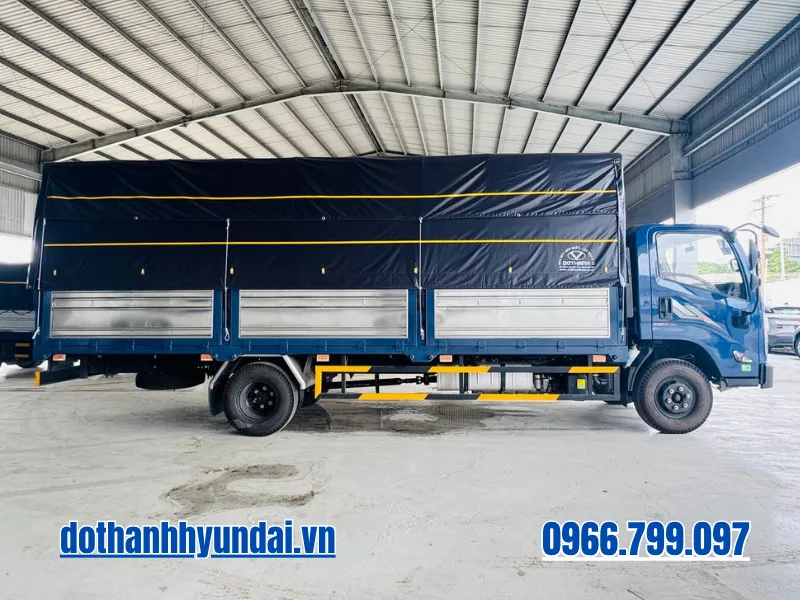 Toàn bộ hệ thống gầm bệ (Chassis) được nhập khẩu đồng bộ và chế tạo từ thép cường lực đặc biệt, tạo ra một “bộ xương sống” vững chãi để gánh vác chiếc thùng mui bạt khổng lồ. Đi sâu vào cấu trúc thùng xe, phiên bản thùng bạt tiêu chuẩn sở hữu kích thước lọt lòng lên đến 6.300 x 2.020 x 2.090 mm. Đây là một lợi thế tuyệt đối. Các chi tiết khung bao, trụ thùng đều được gia công bằng Inox chống gỉ sét, vách ngoài dập sóng chắc chắn. Đặc biệt, sự thấu hiểu nhu cầu bốc dỡ hàng hóa được thể hiện qua thiết kế cửa hông mở hai cánh rộng rãi thay vì một cánh đơn lẻ như các dòng xe thông thường. Thiết kế đột phá này cho phép các xe nâng công nghiệp dễ dàng tiếp cận sâu vào bên trong lòng thùng, rút ngắn tối đa thời gian xếp dỡ các kiện hàng cồng kềnh, kiện pallet tại các kho bãi có không gian chật hẹp. Hệ thống lốp cỡ lớn 7.50-16 (hoặc 7.00R16) giúp phân tán đều trọng lực khổng lồ từ bộ thùng dài 6.3 mét xuống mặt đường, mang lại sự cân bằng tuyệt vời và giảm nguy cơ nổ lốp do quá tải cục bộ.